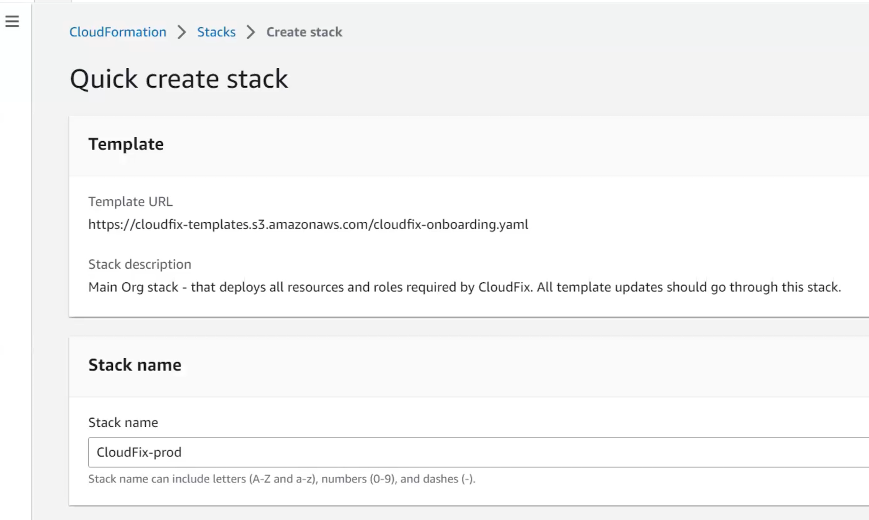 - This main template creates nested stacks that are collectively responsible for deploying all the roles and resources that CloudFix requires. For detailed info: What's in the CloudFix CloudFormation Template?